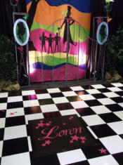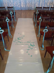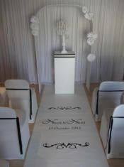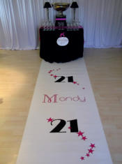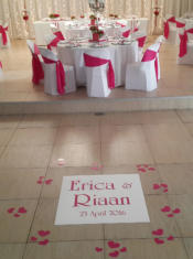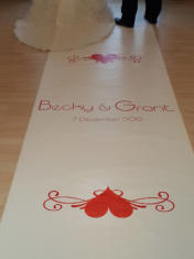 Aisle Runners & Dance Floor DecalsLet Celebrations create a personalised aisle runner and dance floor decal for your special event. These runners are available in 6, 8 or 10 metre lengths and can be personalised in over 30 beautiful colours.The dance floor tiles can be used at the entrance to your venue or in the middle of your dance floor for your first dance. Tiles are available in either black or white as a background to the same beautiful colours as the runners, depicting your choice of text and embelishment